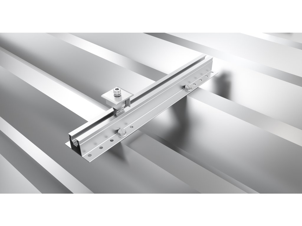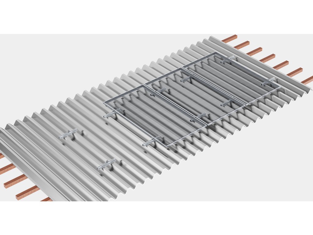 Konštrukcia pre montáž 4 fotovoltických solárných panelovBEZKOĽAJOVÝ systém pre montáž na trapézové plechové strešné krytiny pomocou mini koľajníc podlepených EPDM tesniacou páskou.